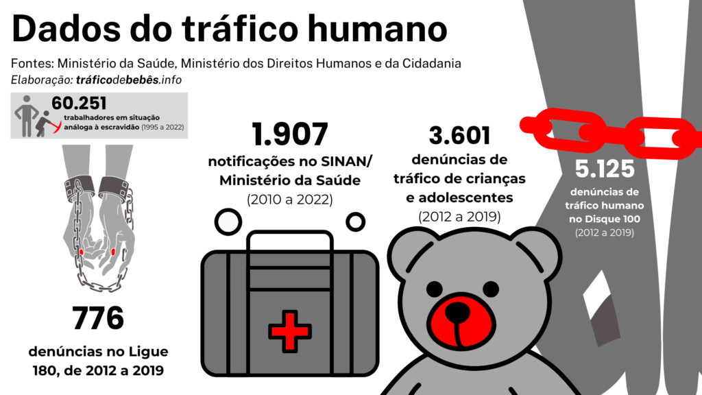 Entre 2012 e 2019, houve no Brasil 5.125 denúncias de tráfico humano no Disque Direitos Humanos (Disque 100), envolvendo 3.601 crianças. Também foram registradas 776 denúncias na Central de Atendimento à Mulher (Ligue 180). Os dois canais são ligados ao Ministério dos Direitos Humanos e da Cidadania (MDHC).